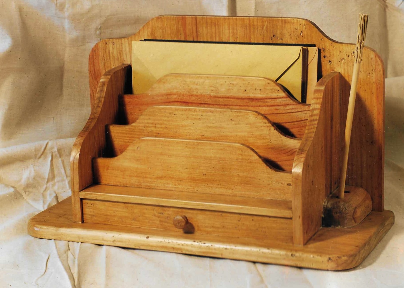 Muestrario de escribanías y muebles de sobremesa. Madera de pino, varias medidas.